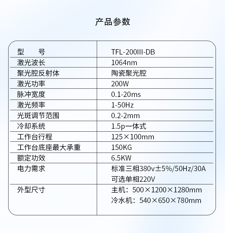 環境濕度:不高于80% 。因為焊機電源打開后,激光晶體就會持續的被冷卻系統冷卻,因為冷卻水一般會低于室溫,當環境濕度過大的時候,而激光晶體的溫度又低于室溫,這時激光晶體的兩個端面上會凝結水霧,當激光輸出的時候,這些水霧會大大降低激光輸出能量,而且這些附著在激光晶體端面上的水,干了以后,會在激光晶體的膜面上留下痕跡,這將會大大加快激光晶體膜面的老化。所以,為了防止這種情況的發生,冷水機的水溫設定,夏天不可以低于室溫3度,冬天不可以低于5度。